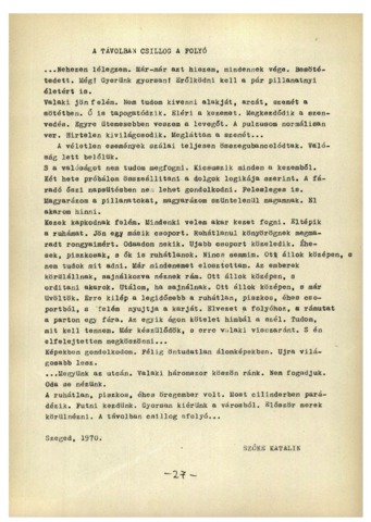 Szőke Katalin: A távolban csillog a folyó. In: Magunk : a JATE Móra Ferenc Kollégiumának időszakosan megjelenő lapja, (10). p. 27. (1970)