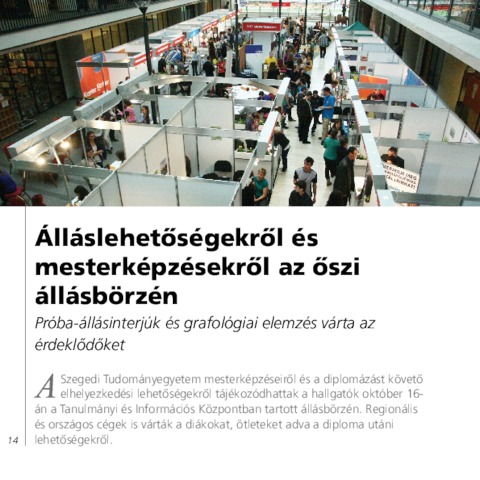 Álláslehetőségekről és mesterképzésekről az őszi állásbörzén : próba-állásinterjúk és grafológiai elemzés várta az érdeklődőket. In: Alma mater magazin. pp. 14-16. (2012)