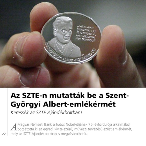 Pintér M. Lajos: Az SZTE-n mutatták be a Szent-Györgyi Albert-emlékérmét : keressék az SZTE Ajándékboltban! In: Alma mater magazin. pp. 22-24. (2012)