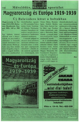 Mac : Magyarország és Európa 1919-1939 : új Belevedere [!Belvedere] kötet a boltokban. In: Egyetem : a szegedi felsőoktatás információs háttérmagazinja, (3) 6. p. 8. (2001)