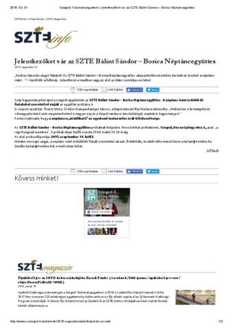 Jelentkezőket vár az SZTE Bálint Sándor - Borica Néptáncegyüttes. In: SZTE Info. (2015)