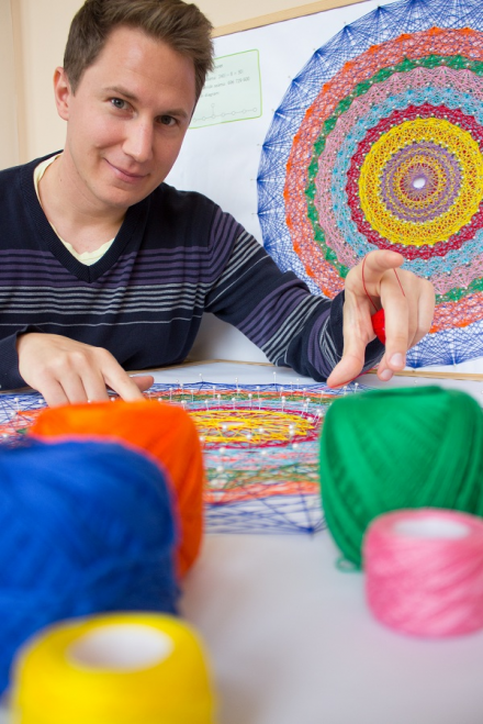 A szimmetria mint eszköz központi szerepet tölt be a kutatásaimban. Ebből ered az a motivációm, hogy mások számára is elérhető közelségbe hozzam, megmutassam a matematika általam ismert szépségeit. A fonalgrafikák készítése is matematikán alapul: egy kocka sokféle árnyékot vethet, de a legtöbb szimmetriával rendelkező vetületet csupán a négy testátló bármelyikével párhuzamosan világítva kaphatjuk meg. Ez a módszer magasabb, például négy vagy nyolc dimenziós alakzatokra is alkalmazható. Így keletkeztek a fonalgrafikák gombostűi által jelölt pontok, a színes cérnaszálak pedig az éleket jelzik.