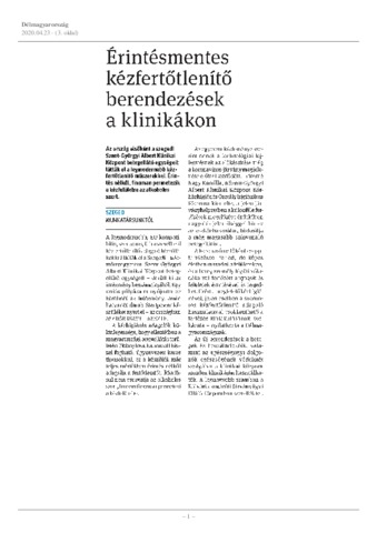 Érintésmentes kézfertőtlenítő berendezések a klinikákon. In: Délmagyarország, (110) 95. p. 3. (2020)