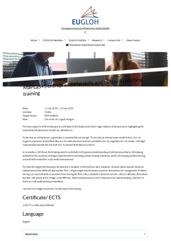 | Kulcsszavak: | Nemzetközi projekt - European University Alliance for Global Health - EUGLOH - Európai Egyetemi Szövetség, Kurzus - online - MaPLaS+S entrepreneurial skills and self-audit pitching, Tréning - online soft skill, Egyetemi hallgatók |