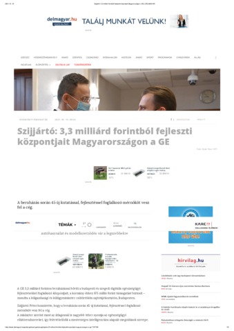 Kormánytámogatás : Szijjártó: 3,3 milliárd forintból fejleszti központjait Magyarországon a GE. In: Delmagyar.hu. (2021)